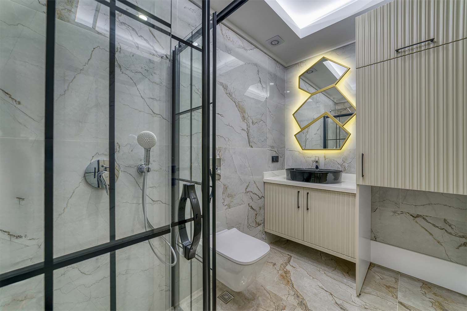 Üst düzey malzemelerle donatılmış şık ve modern banyolar.